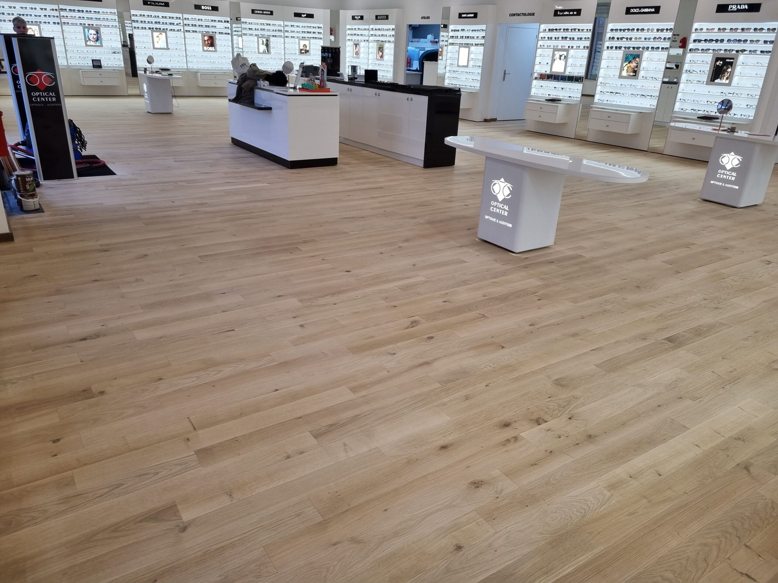 Le centre Optical Center de Tourville-la-Rivière nous a confié la remise en état de ce parquet en chêne huilé suite à un usage intensif, et malheureusement des dégradations qui ont fortement abimé certaines zones.